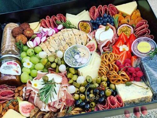 Mini Croissants, Pan au Chocolate, Cinnamon Rolls, Homemade Honey & Raisin Granola, Tiptree Honey, Yoghurt, Honey Roast Ham, Emmental Cheese, Tiptree Strawberry Jam, Grapes, Fresh Figs, Passion Fruit, Blueberries & Strawberries