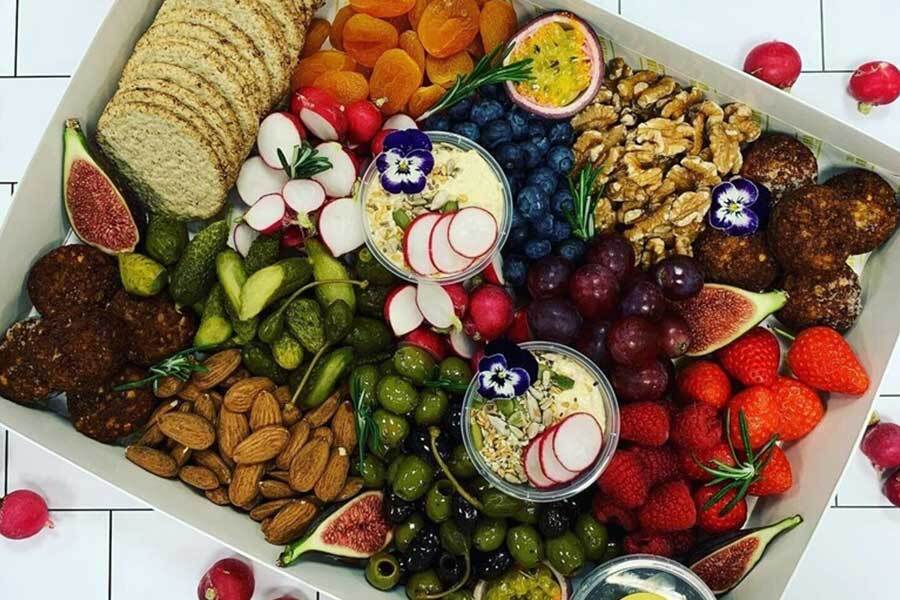 Vegan Crackers, Falafel, Hummus, Sundried Tomato Tapenade, Walnuts, Almonds, Dried Apricots, Olives, Cornichons, Grapes, Radishes, Fresh Fig, Strawberries & Blueberries