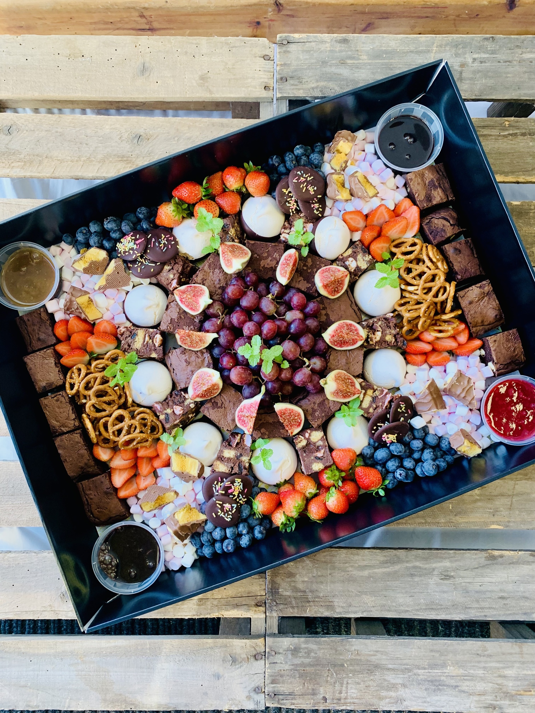 Double Chocolate Brownies, Pretzels, Caramel Sauce, Rocky Road, Meringues, Chocolate Sauce, Fresh Figs, Berry Coulis, Chocolates, Blueberries & Strawberries