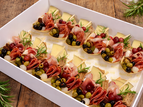 12 individual bamboo canape boats filled with charcuterie delights.