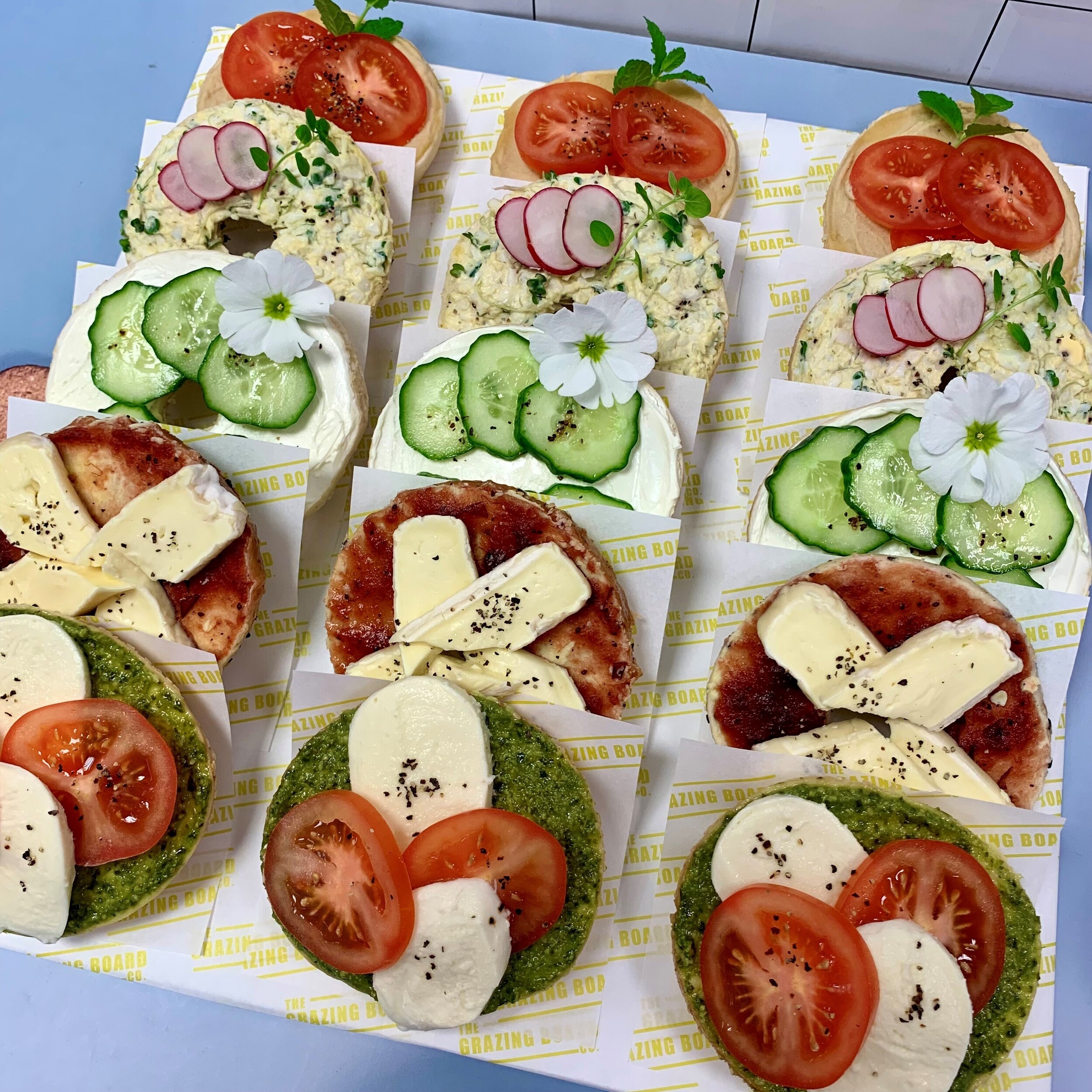 Contains 15 open bagels: Hummus & Tomato Ve Egg May & Watercress V Cucumber & Cream Cheese V Brie & Cranberry V Mozzarella, Tomato & Pesto V