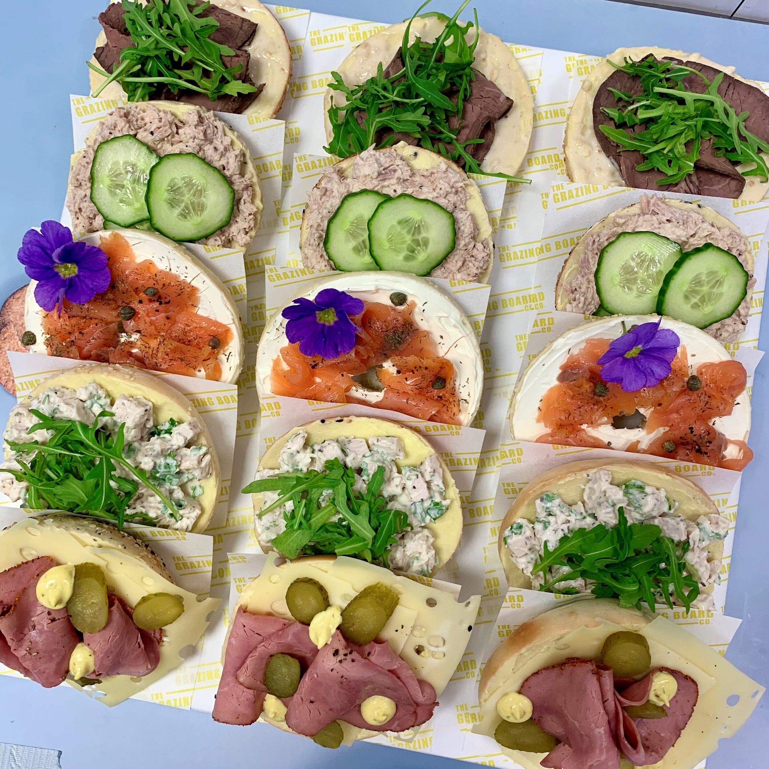 Contains 15 open bagels: Roast Beef & Horseradish Tuna Mayo & Cucumber Smoked Salmon & Cream Cheese Chicken Mayo Salad Emmental & Pastrami