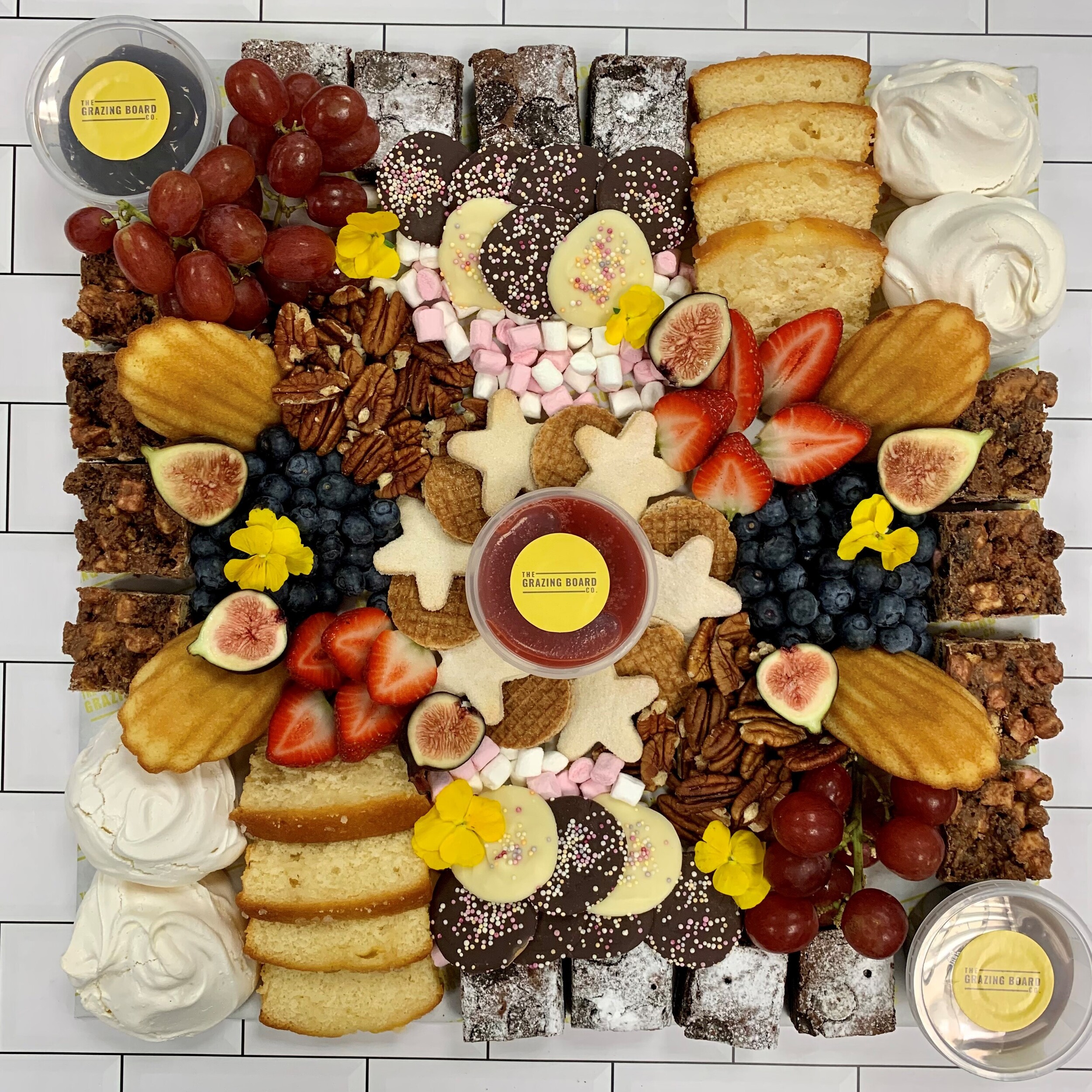Lemon Drizzle, Chocolate Brownie, Rocky Road, Meringues, Madeleines, Chocolate Sauce, Butterscotch Sauce, Berry Coulis, Fresh Fig, Strawberries, Blueberries, Grapes, Pecans, White & Milk Chocolate Thins, Mini Marshmallows, Shortbread Biscuits & Caramel Waffers.