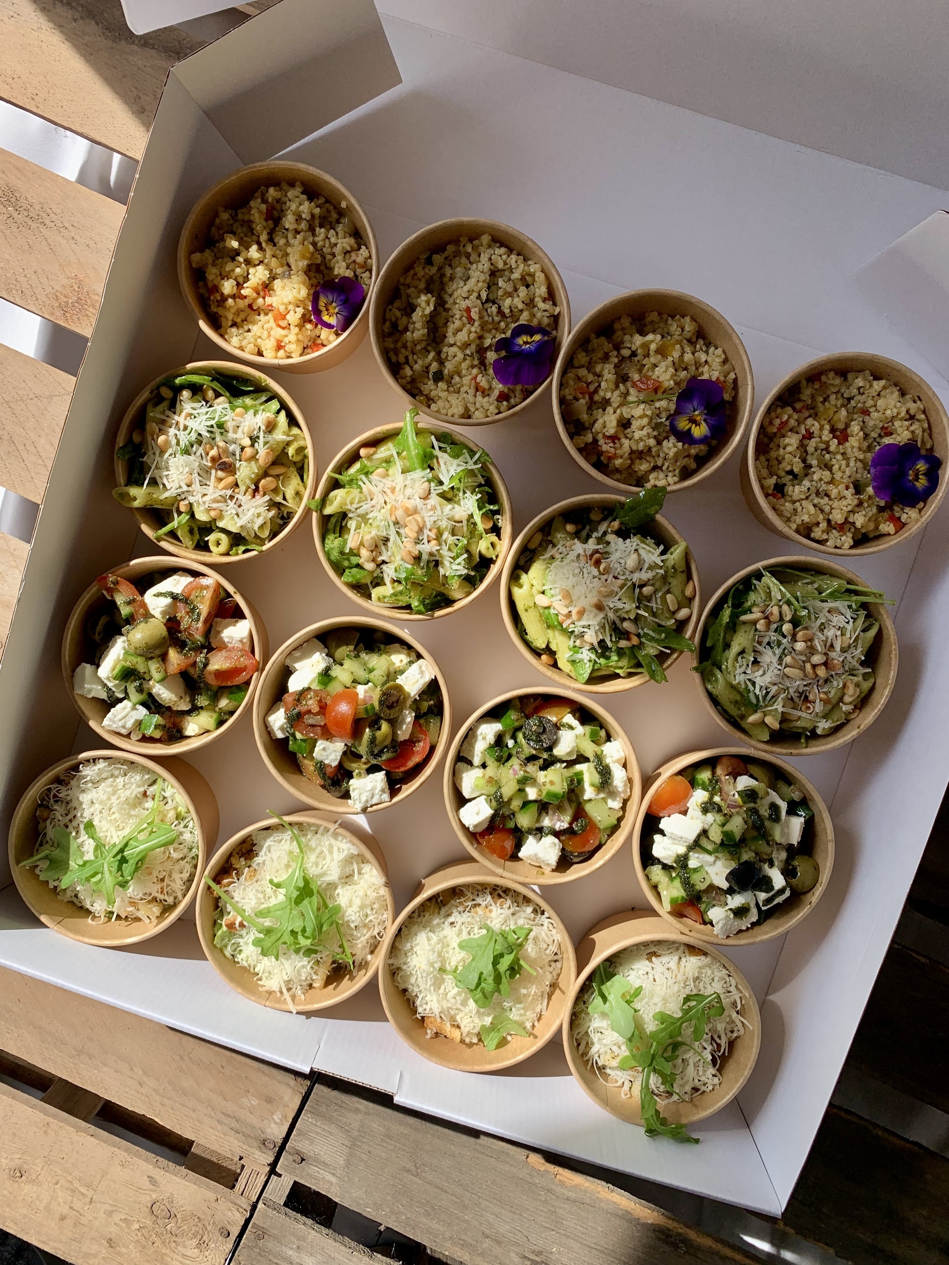 Caesar Salad, Greek Salad, Chickpeas With Bell Peppers, New Potato Sour Cream & Chives, Quinoa & Carrot Salad, Lemon Coriander & Mint Couscous, Pesto & Rocket Pasta Salad, Buckwheat With Med Veg, Chunky Coleslaw.