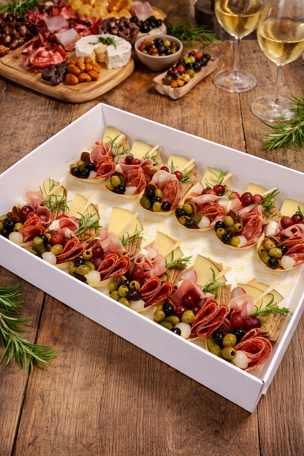 12 individual bamboo canape boats filled with charcuterie delights.